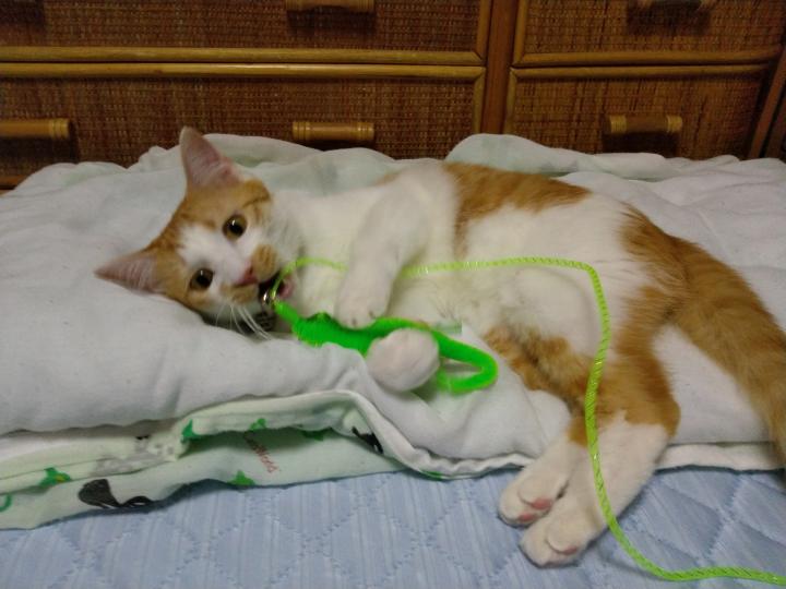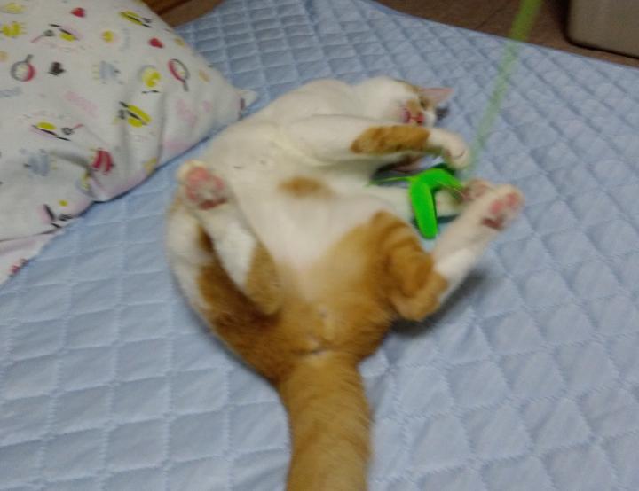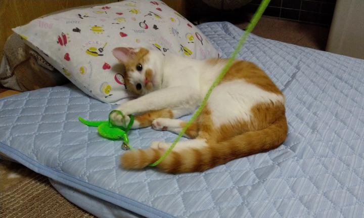 飛んでくる理由は、毎日布団を敷いたら、そこで猫じゃらしタイムにしてるのです