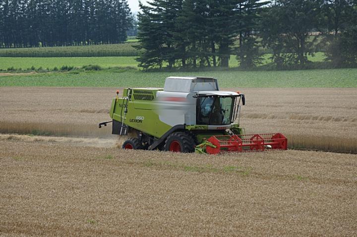 で、黄金色に実った小麦を、大型コンバインで一気に刈り込む。