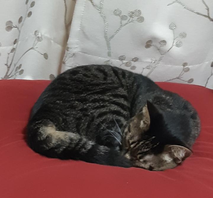 床近くで生活しているチロちゃんにとっては、冷房がキツイのか、その割によく冷える場所に置いてあるこのクッションが好きなのか…冬場でも滅多に見せないこのポーズでよく寝ています。