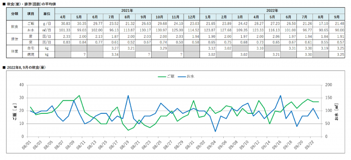 しもちゃんの飲食(量)・排泄(回数)に関する記録です。8月は一時10g/日も食べず心配しましたが、元に戻ってきました。