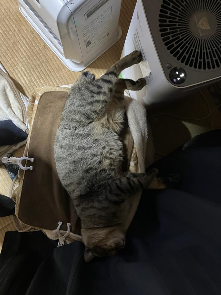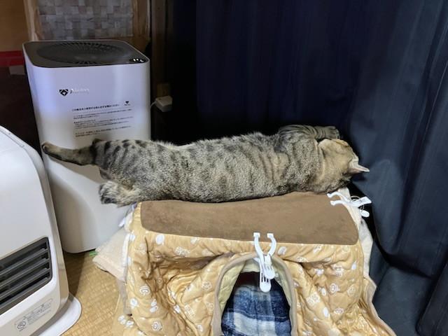 スバルお坊ちゃんパトロールで疲れて猫用コタツの上で寝てます。今朝みたいにスプレー攻撃食らわないようにエアドックの位置を変更、足を伸ばして3歳児のはずなのに寝姿はオッサン!飼い主に似ると言うけれど全くその通りです!犬猫の知能は人間でいうなら3歳児程度という事ですが