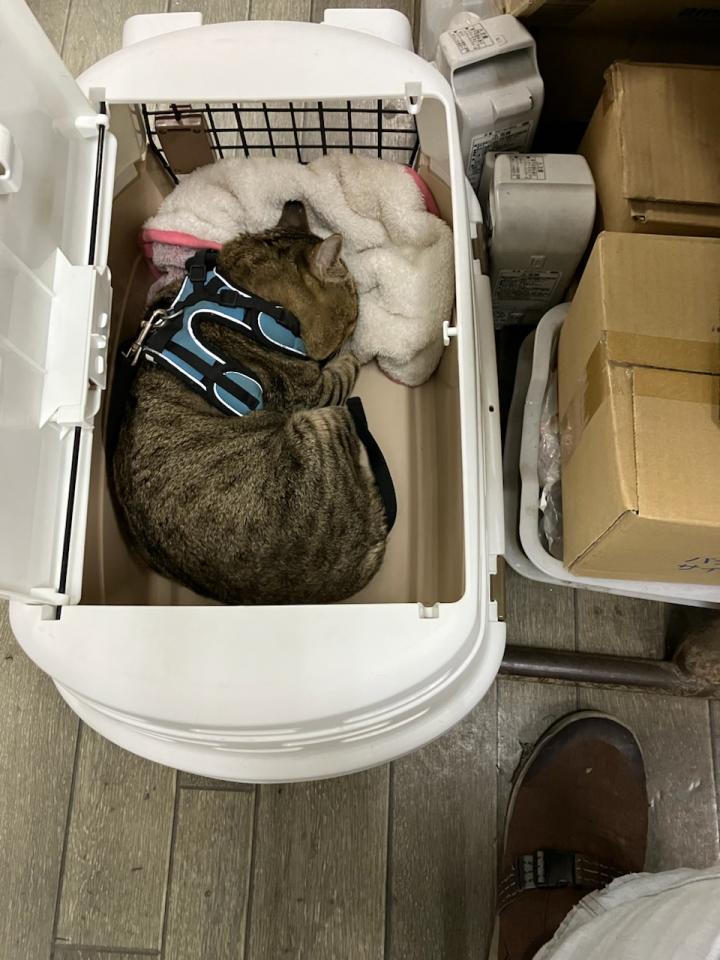 スバルお坊ちゃんお外に出るのが好きなようで車で往復70分程買い物ついでにドライブにキャリーケースをシートベルトで固定して上蓋外してリードはケースから出ないようにくくって時々後ろ足を上にあげたら左手で押し込むようには何回か有りましたがほとんど大人しく写真の様な体制でした。雨の日とか散歩出来ない日はこれで過ごそうかと思います。2枚目の写真は帰りに立ち寄ったバイク屋さんでの写真撮ってです。ケースの中で寝ていました。お利口さんなスバルお坊ちゃんでした。