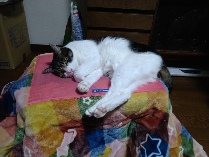 相変わらずニャンこたつの中ではなく上が好きなしおみちゃん^^