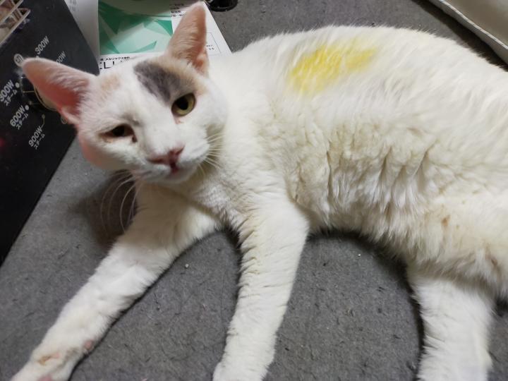 しろは寒がりで、電気ストーブで毛がこげてます。(虐待ではない😅)