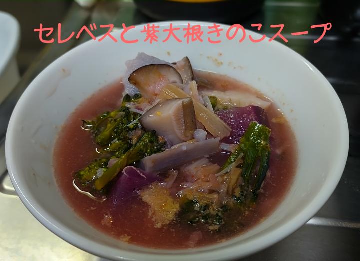 紫大根や沢山のきのこでスープにしました🍄