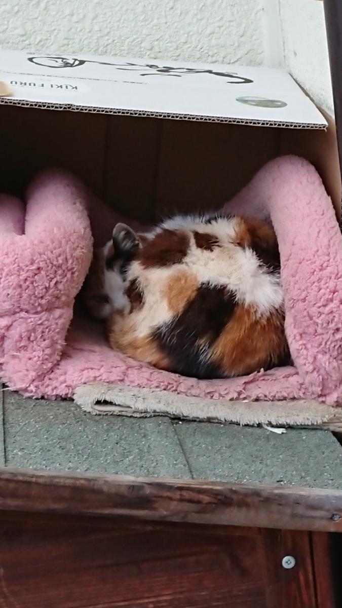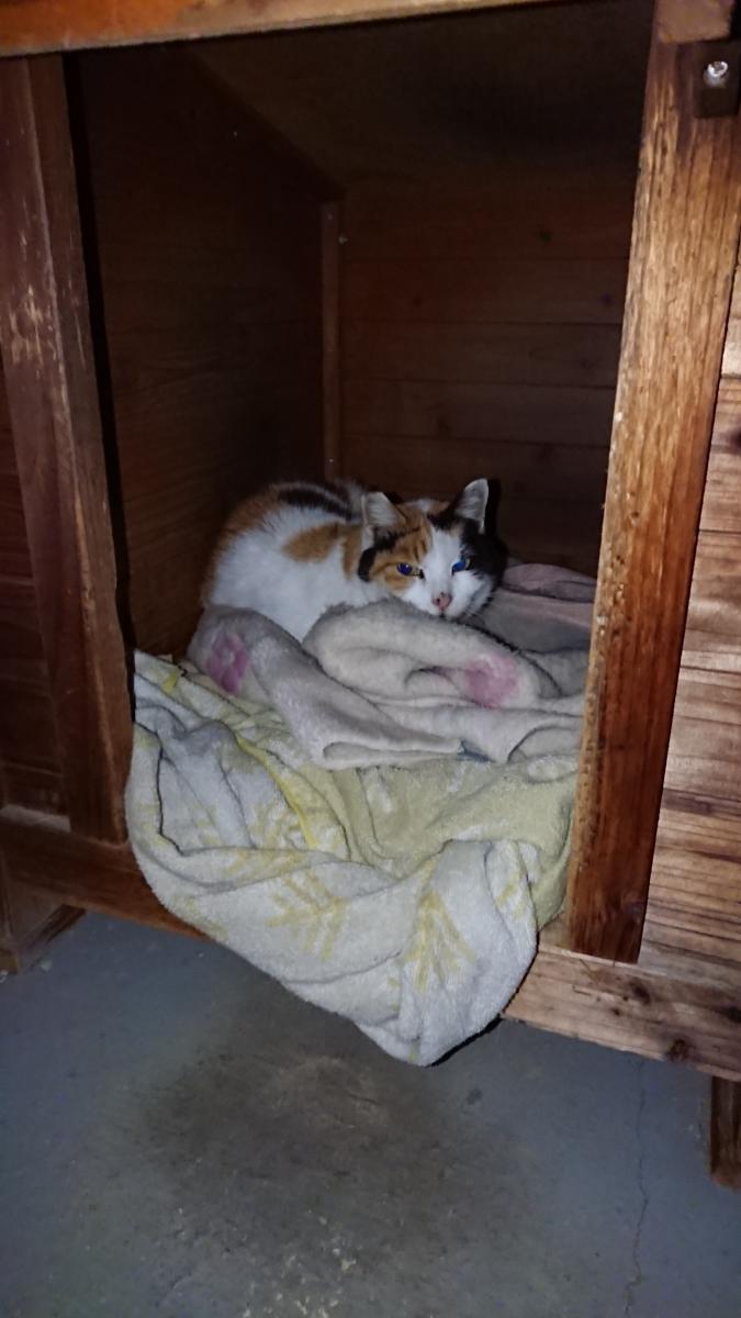 ところがネコ14号が我が家へお食事に通いはじめてすぐに、ネコ3号ハウスで寝ている14号を発見…