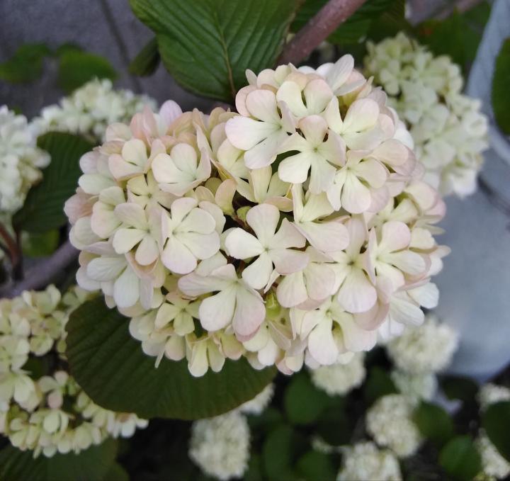 オオデマリです。本州~九州に自生するレンプクソウ科ヤブデマリの改良種といわれています。アジサイのように、すべての花が装飾花になって、丸っこくなったものです。普通、グリーンから白に花色が変わります。画像のものはピンクっぽいので、品種名が付いたものかもしれません。🐕