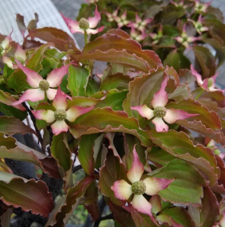 ヤマボウシの紅花ですが、品種名は判りません。中国原産の常緑性品種かもしれません。在来種は落葉性の白花が多いです。近くのマンションの植栽に使われていました。🦆