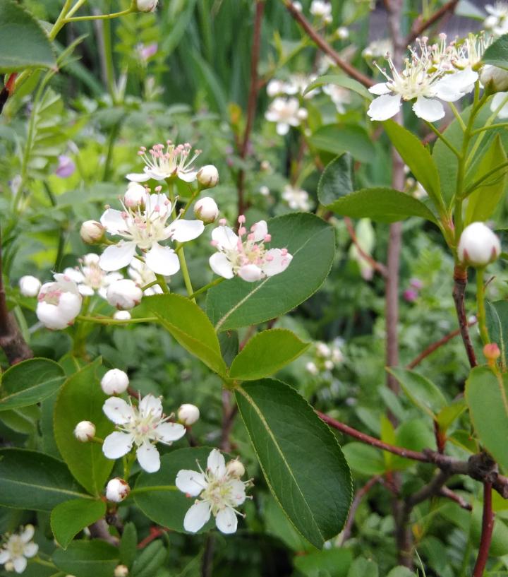 アロニアです。北米原産、バラ科の落葉低木です。ブラックチョークベリーなどと呼ばれ、健康食品として人気があるそうです。団地の庭で見かけました。実を食べたいとは思いませんが、花だけ見てもよい感じですね。🐑