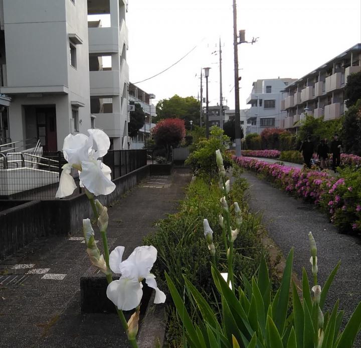 ジャーマンアイリスです。薄曇りの午後、団地の辺りをゆらゆら歩いていました。白のジャーマンアイリスが目について写してみました。