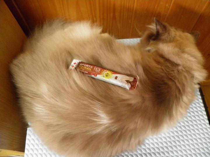 ポテコの背中にあるのは、パパちゅーる(スポーツようかん)です。