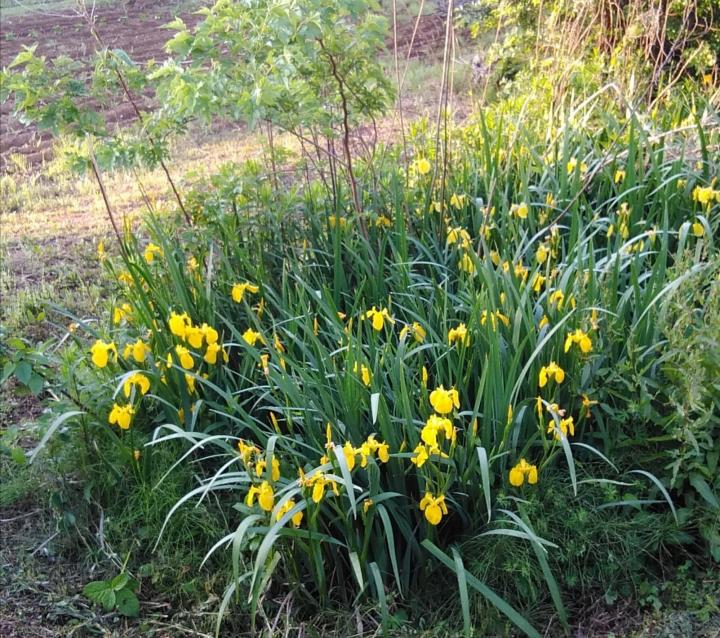 キショウブ(黄菖蒲)です。アヤメ科の多年草、西アジア~ヨーロッパが原産で、明治時代に観賞用として日本に入ってきました。繁殖力が強く、現在では北海道~九州まで野生化しています。近くの畑で毎年花を咲かせています。生態系被害防止外来種に指定されています。🐕