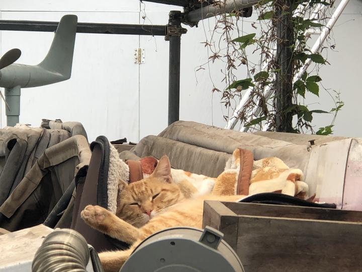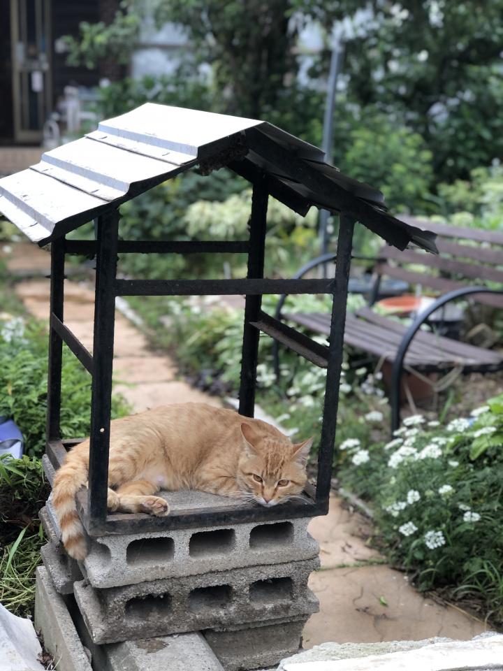 今日は雨、お庭の屋根だけ倉庫の棚にある猫ベッドで気持ちよく昼寝するなお。