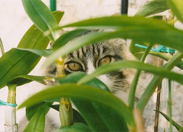 私のコレクションのランの葉っぱの後ろに隠れて見せるいたずらっ子顔