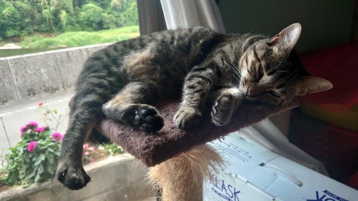 何故か古いキャットタワーに好んで寝るむぎ😹
