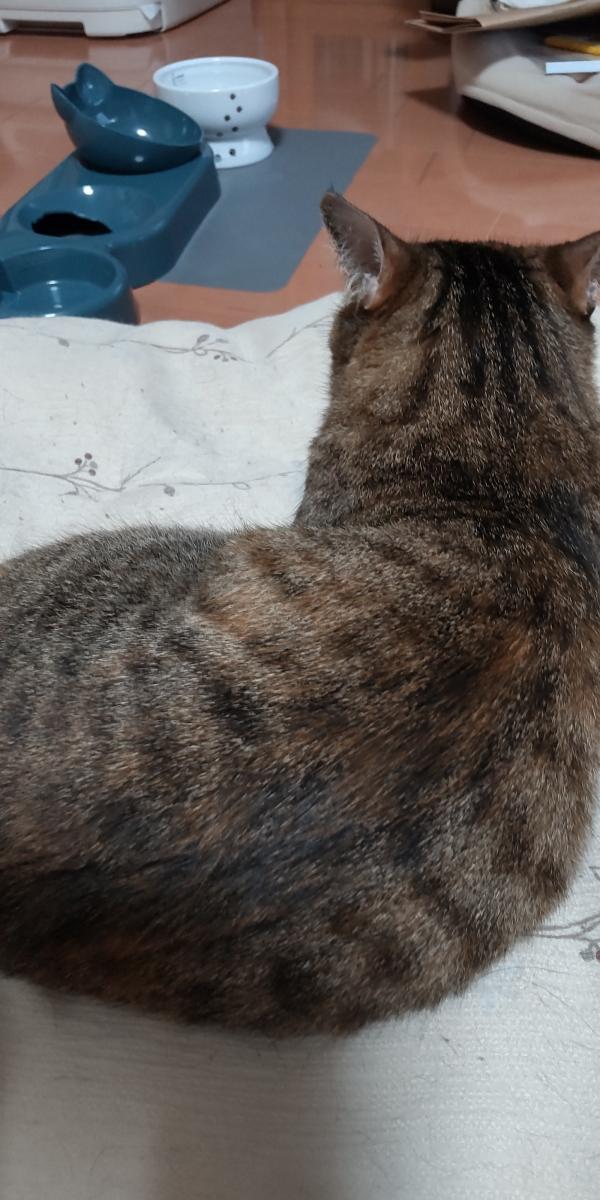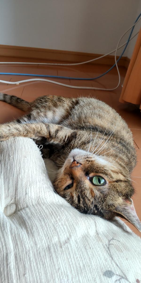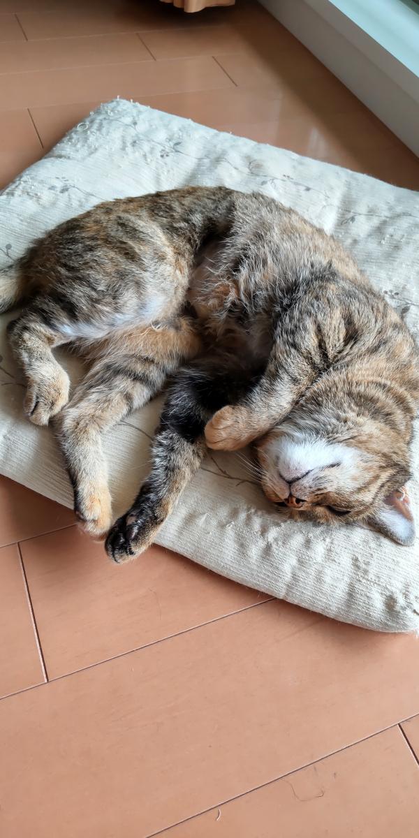 キキさんはベッドに上がり足元で丸まってました。今朝はリビングのいつもの処で抗議のゴロ寝。さらに座布団に爪を立ててケリケリしてはニャーニャー団活動に勤しんでおります。