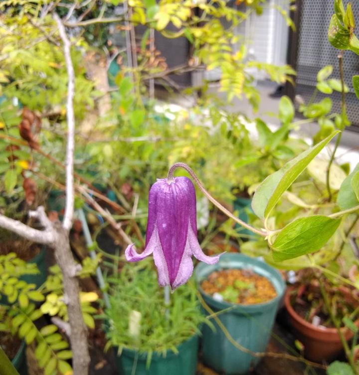 クレマチス"篭口(ロウグチ)" 四季咲き性のクレマチス、クルクルと弦が伸びません。支柱に茎を結わえてあげれば大丈夫です。うどん粉病になりやすいので、時々消毒します。🐿️