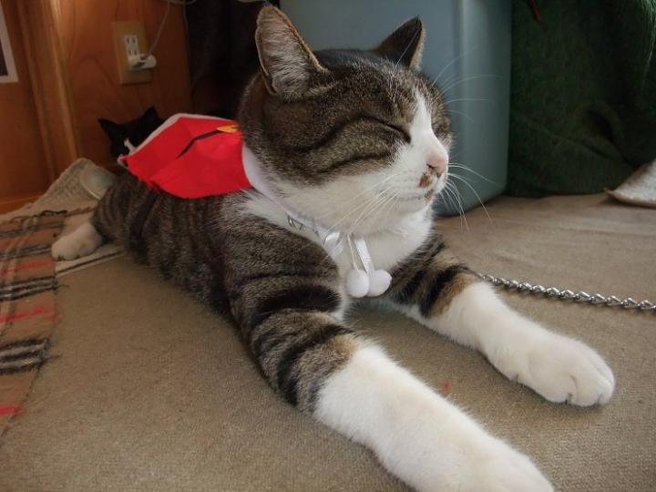 おデブライカ君も、ベルトの部分緩めて止めれば十分着こなせます・・・・・・・・が、ライカは体が大きくて特に、“着てる”というか“マント被ってる”みたいに見えます。