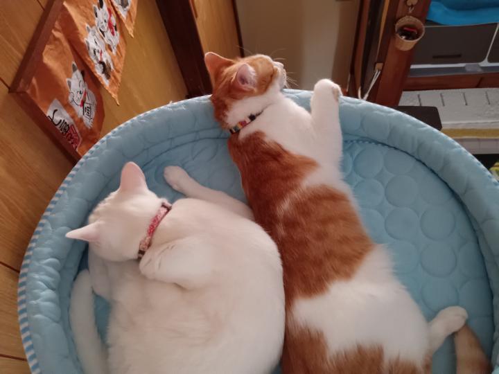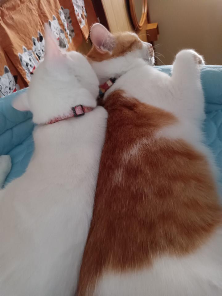 もっちーが広いベッドの隅で寝ていた所に入れてあげたうなたん