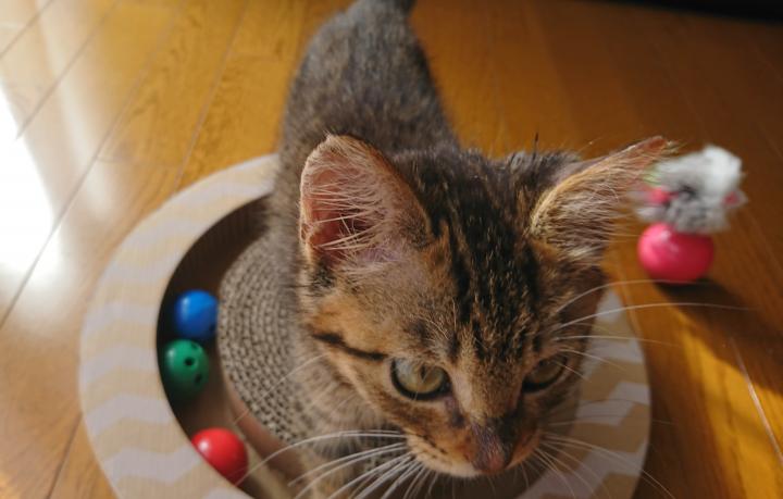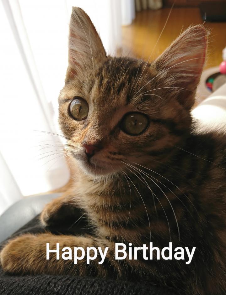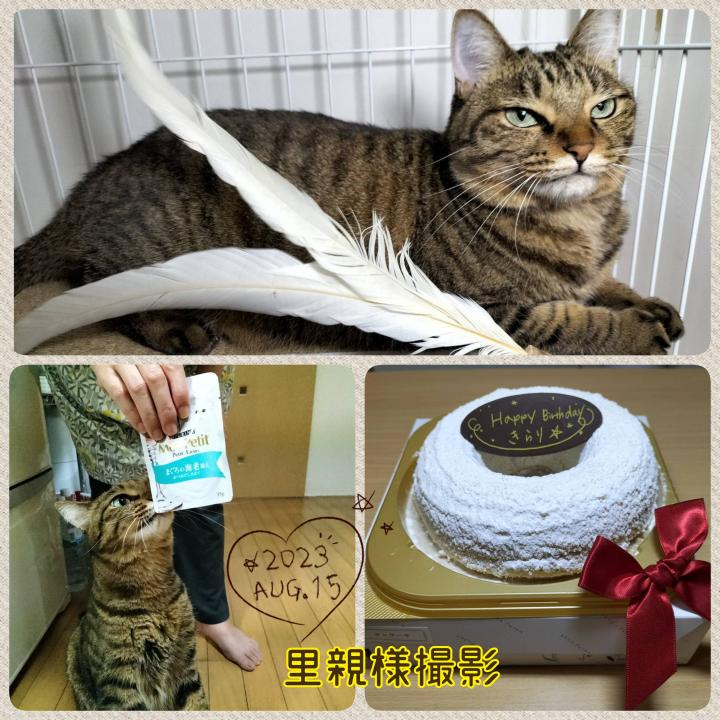 上段の写真:わが家では里親様からいただいた〈じゃらし〉は大人気で羽はもはやクタクタになっておりますが、きらり(光輝)ちゃんは大人しくてあまり興味がないとか。下段:大好きなモンプチと大きなケーキ🎂でお祝い。大切にしてもらって幸せ感漂ってます🎶