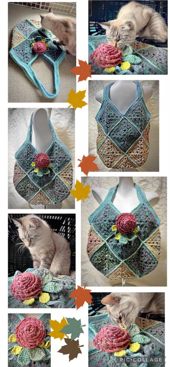 ↑上のコサージュ付きモチーフ繋ぎのバッグは、