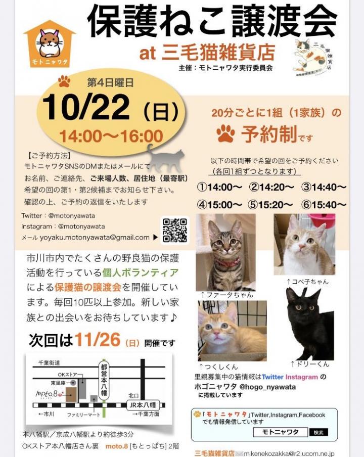 本八幡の三毛猫雑貨店さんにて定例の譲渡会を開催します。