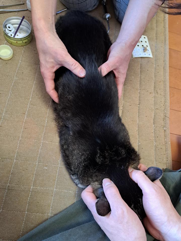 先生の手がある辺りをグリグリして、お灸をして、張っている胃腸を動かします。よく吐く子や便秘気味の子におすすめです。是非。