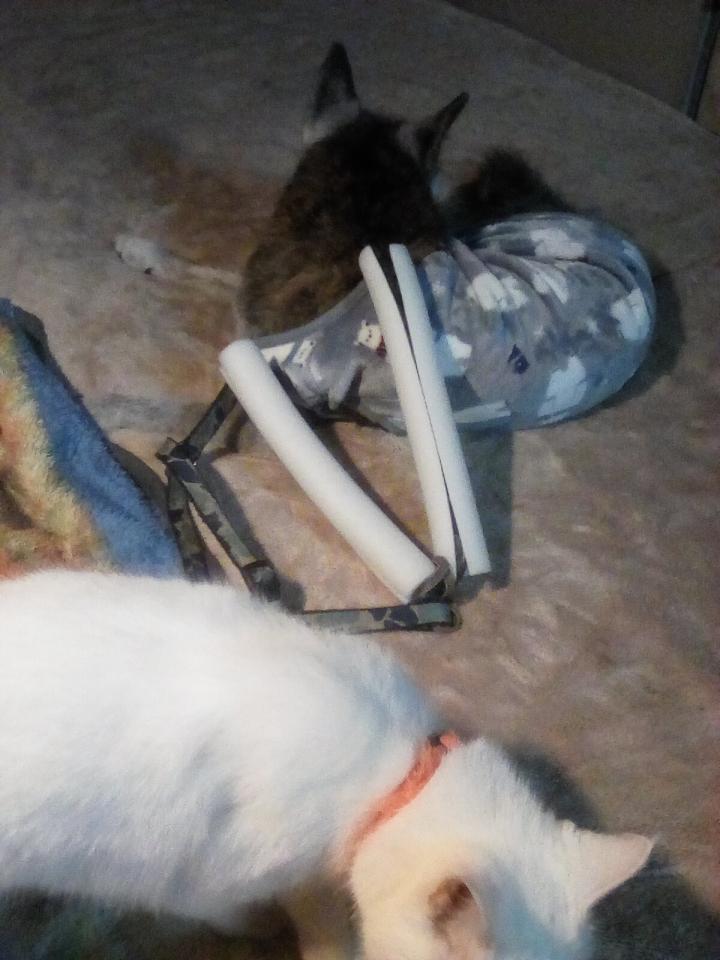 まだ自力で歩けるので後ろ足サポートハーネスを買わずに、通常の胴ハーネスに塩ビパイプ凍結保護用のポリパイプをつけて衝撃緩和。元のハーネスが少しでかかったのでまあイケる。