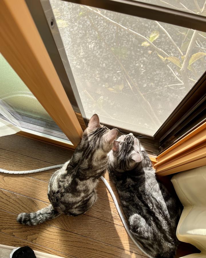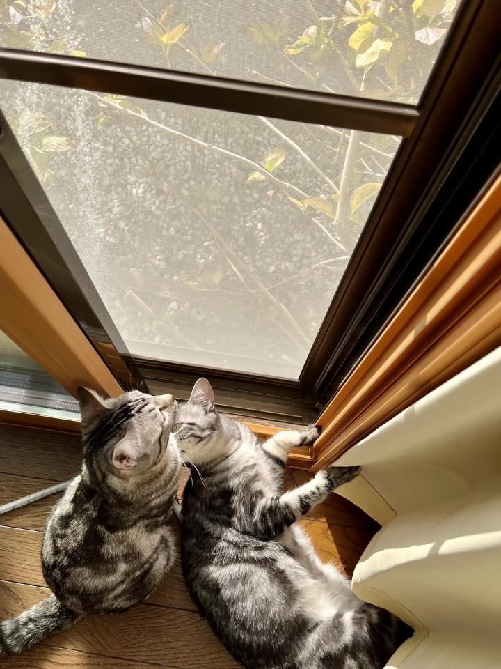 寒いのに、網戸の前でずーっと外を見ている二匹。