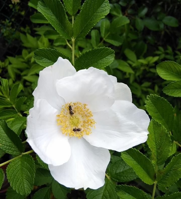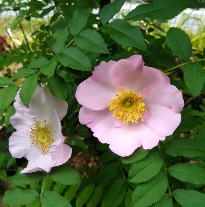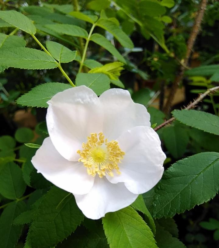 オオタカネバラ(白花) バラ科の落葉低木、北海道、本州高地など冷涼な地域に分布します。東京では少し暑がりますので、夏は寒冷遮をかけて、風通しも図るようにしています。🐏