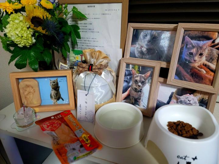 そんな昨日、一周忌を迎えたみゃーちゃんにと妻がみゃーちゃんの首輪の色と同じだった花を持ってきてくれて、線香に火をつけてみゃーちゃんに御供えをした。