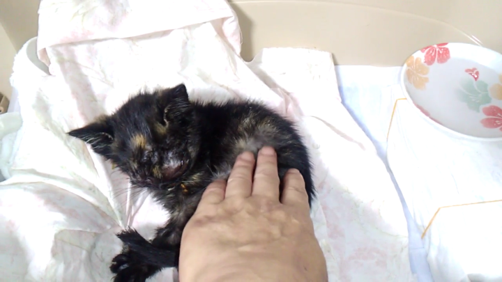7月5日の子猫の動画です。写真では痛々しい顔の傷をなるべく避けましたが、動画には映っています。