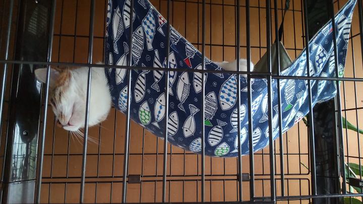 ミラはよくこんな風に、ハンモックから頭だけ出しています。痛くならないの?