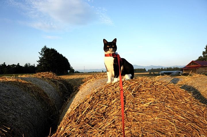 大きな麦稈ロールの上に佇む。