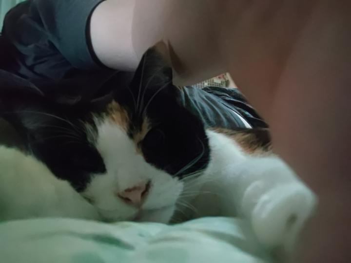 2018年2月、なついていた野良猫を飼う事にしました。 三毛の女の子です。 完全室内飼いしています。外に出たがったりしないので助かります。 抱っこは苦手だけど、添い寝は大好きな娘です。
