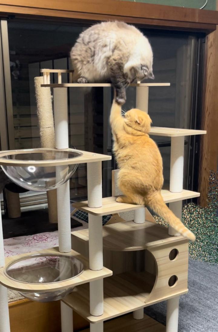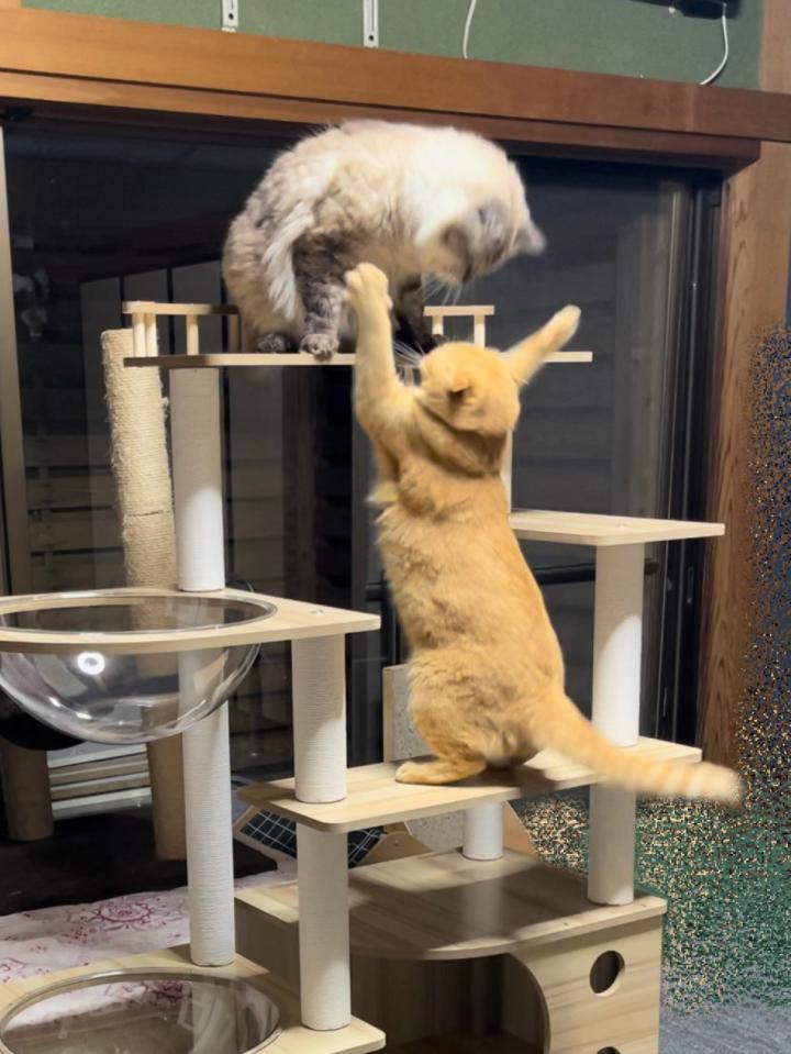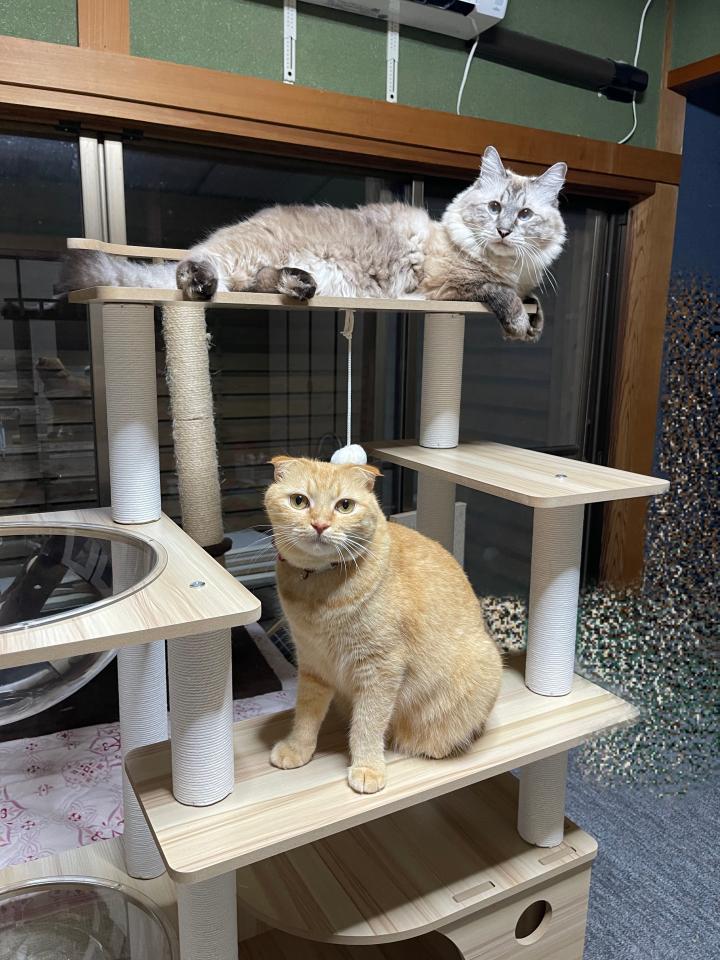 今年は誕生日のお祝いとして新しいキャットタワーを新調し、せっせと組み立てる事30分程!ようやく完成したと思ったら早速こまちゃん♀とまりも♂が飛び乗ってきました!