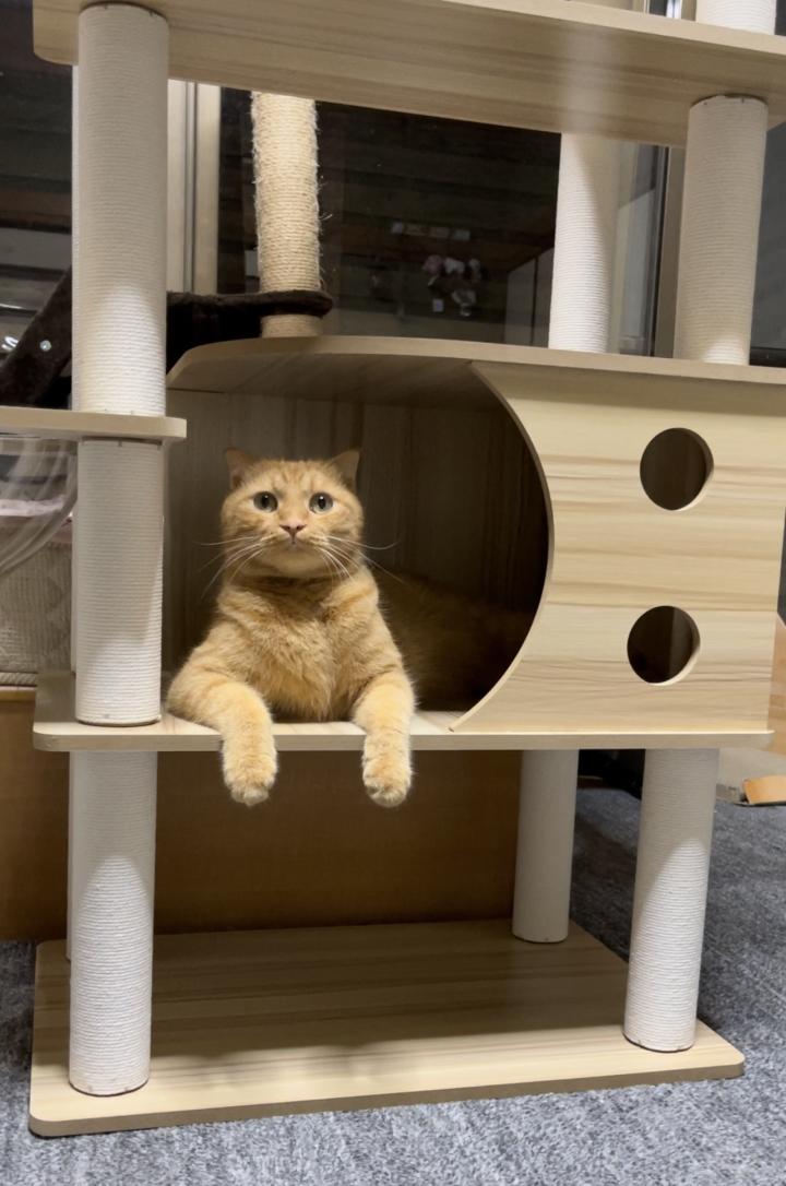 たまおちゃんはいつもキャットタワーにはあんまり登らないので、暫くは全く使ってませんでした(´,,•ω•,,`)