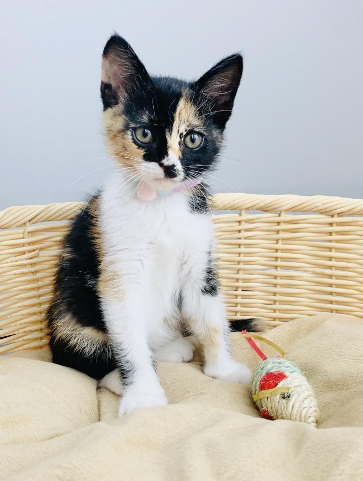 いけちゃん。三毛。3ヶ月。元気な甘えん坊です。人も猫も好きです❤️→何と、トライアル中です💙🩷