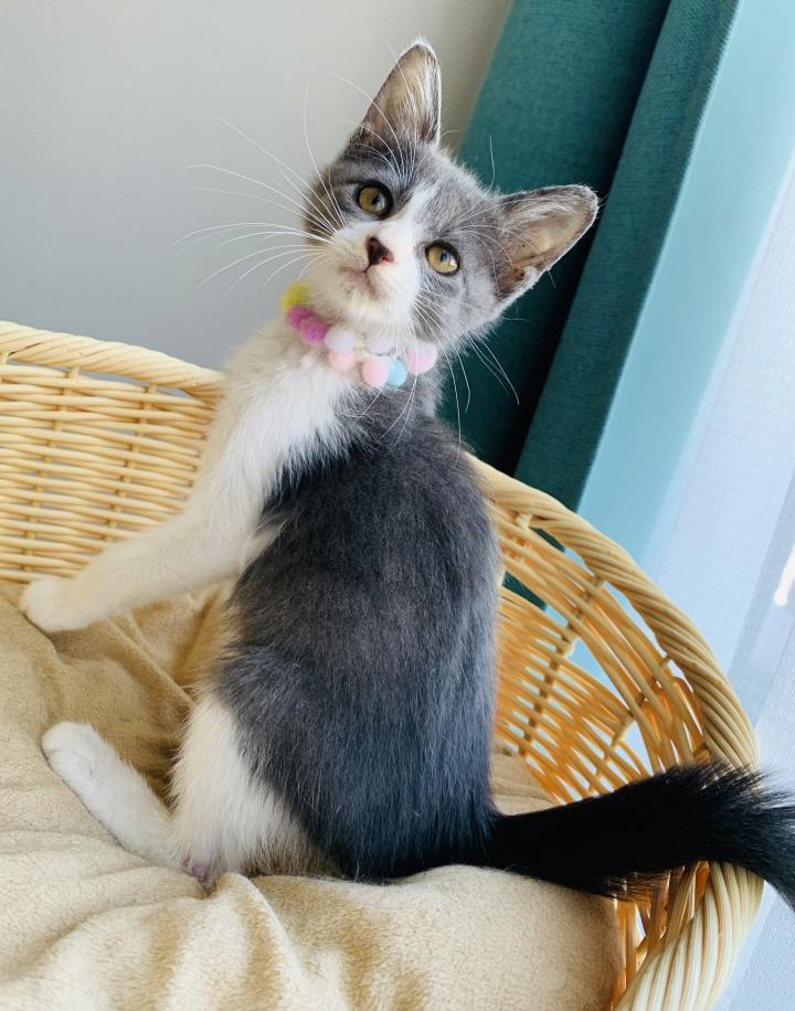みみちゃん。グレー白のハチワレ。何とも独特な毛色が可愛い2ヶ月の女の子☘️