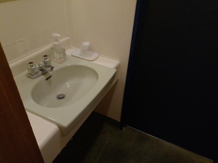 お部屋は四畳半の和室にお布団、そしてバストイレは無いけど洗面付き。