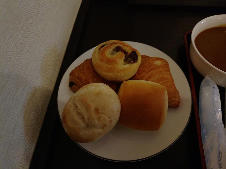 必要十分なおかずで和定食風に、パンを山盛り、朝食ブュッフェ大好き!