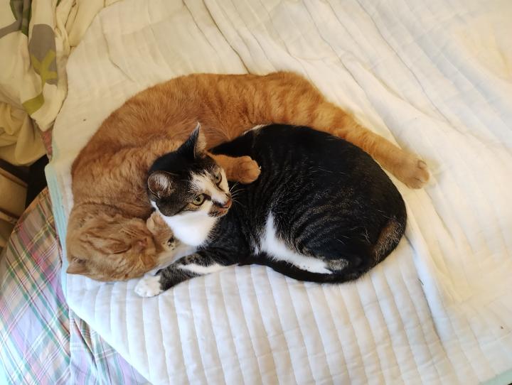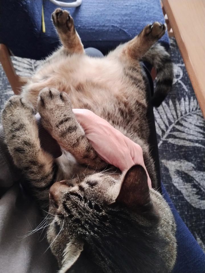 わたしの膝で😻💖自分から乗ってきたんと違いますよ。テーブルの上で、フルフルいいながら近づいてきたら、こうやって抱っこすると、しばらくおとなしくしてるんです。