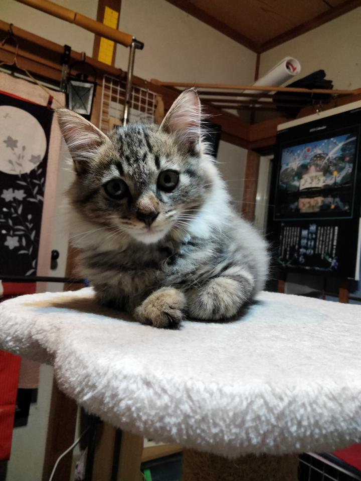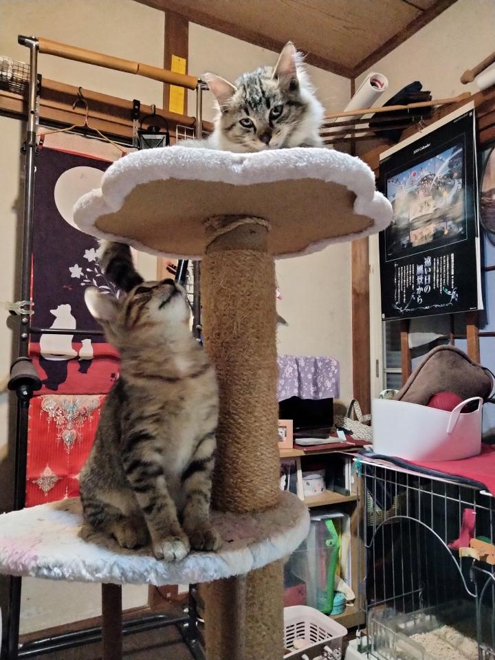 下にいる短毛種の子は人懐っこく、上の長毛種の子は短毛種の子ほど人懐こくないけれど興味はあるのかこちらを覗いてる