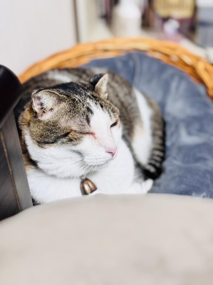 遠慮して、ベッドの横の猫ベッドで私見ながら寝るりんりん