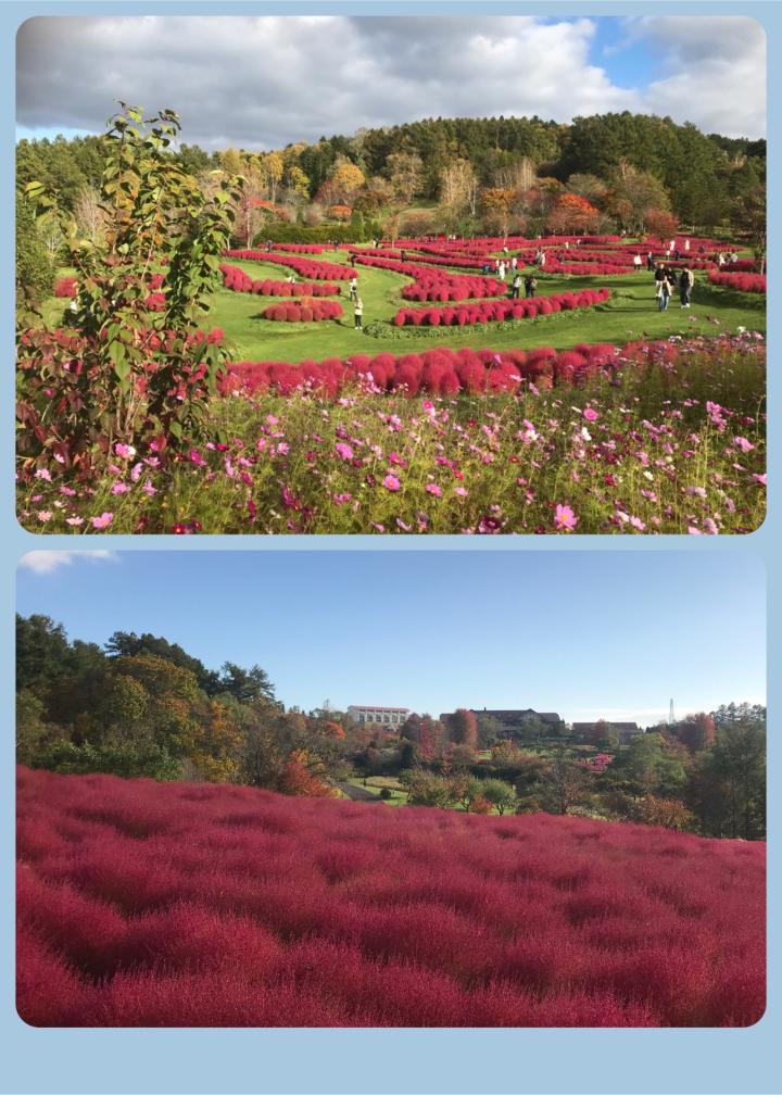 コキアの赤とサルビアの朱色が競い合っているようでした。