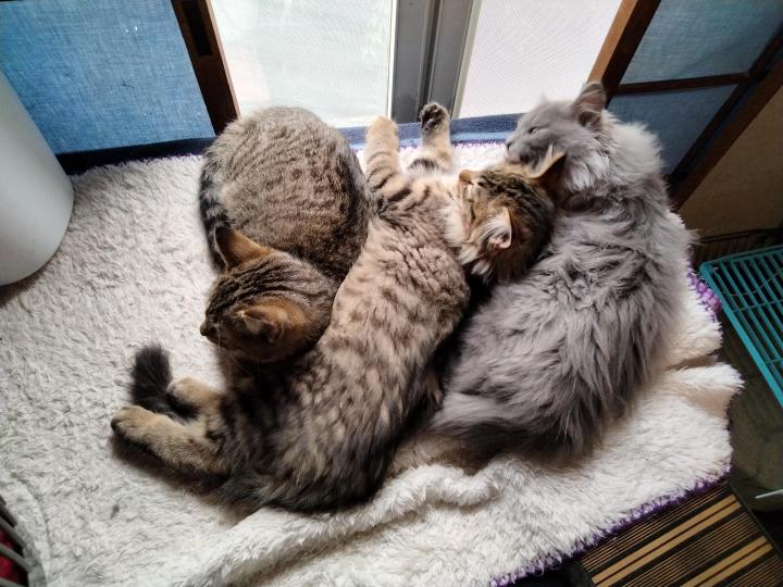 こっちはゲージの上で寛ぎ中。また違う組み合わせだけど。一匹が顔を他の猫の毛に埋もれてる時があったのにシャッターチャンス逃しちゃった😖