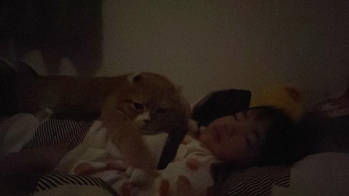 愛娘のお腹の上に乗ることなかったのに、突然お腹に乗って寝た^ - ^