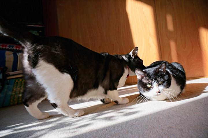 ケージの外で出逢ったら、空がチョビの匂い嗅ぎまくり。