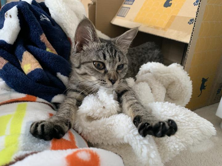 キジトラおんぷちゃん。びびりを全面に押してますが、本当にびびり。慣れてる方からの応募お待ちしております😿ケージの中に居ると大人しい。