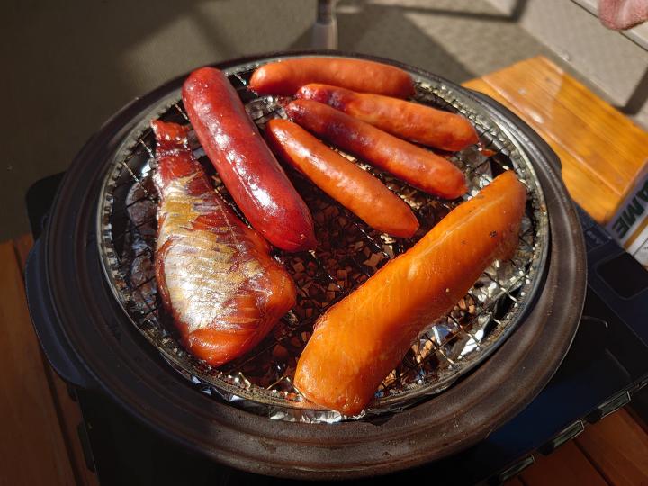 ニジマスの他にウィンナー、カルパスをスモークしてみました。